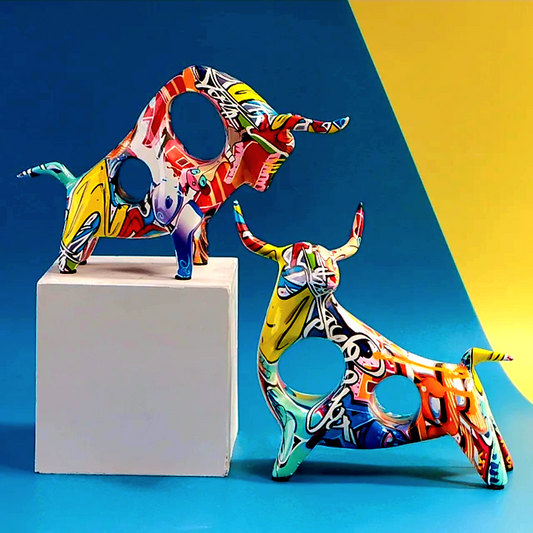 Painted Graffiti Bull Sculpture Set of 2 Pcs - 25x15 cm | 20x19 cm